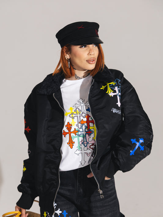 Bomber con stampa diretta e cerniera.