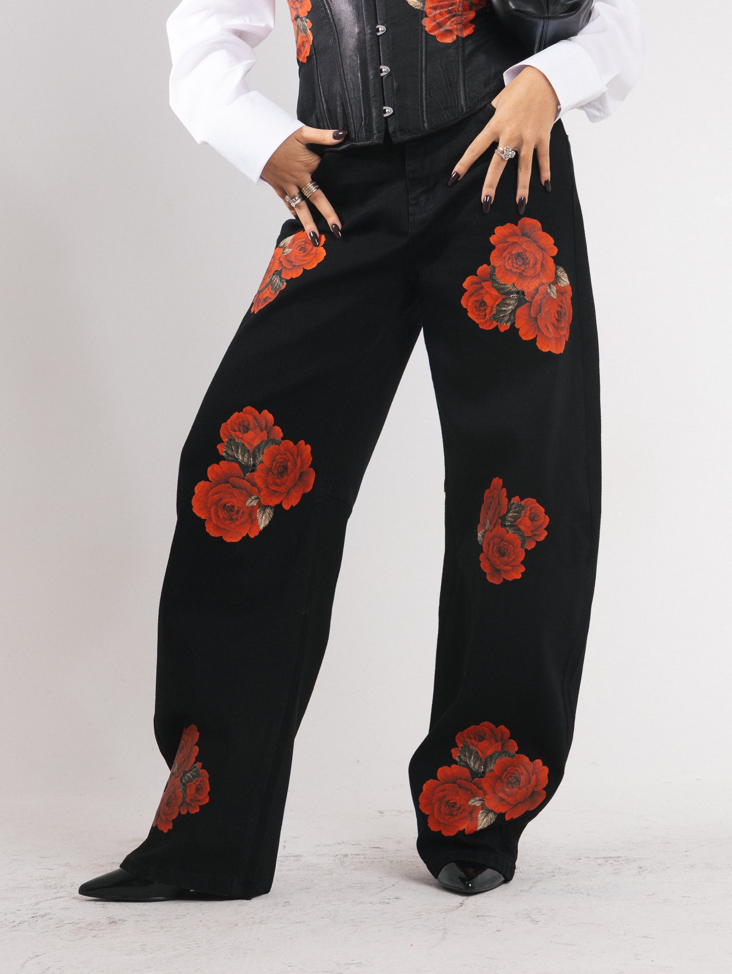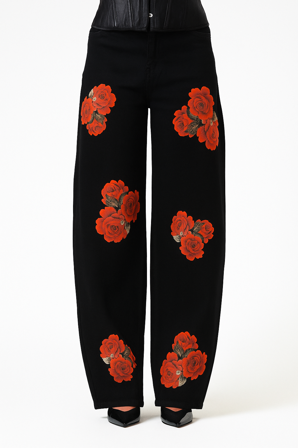 Taglio ampio su fianchi e cosce con forma curva, che si stringe verso la caviglia. Vita media. Tessuto rigido.