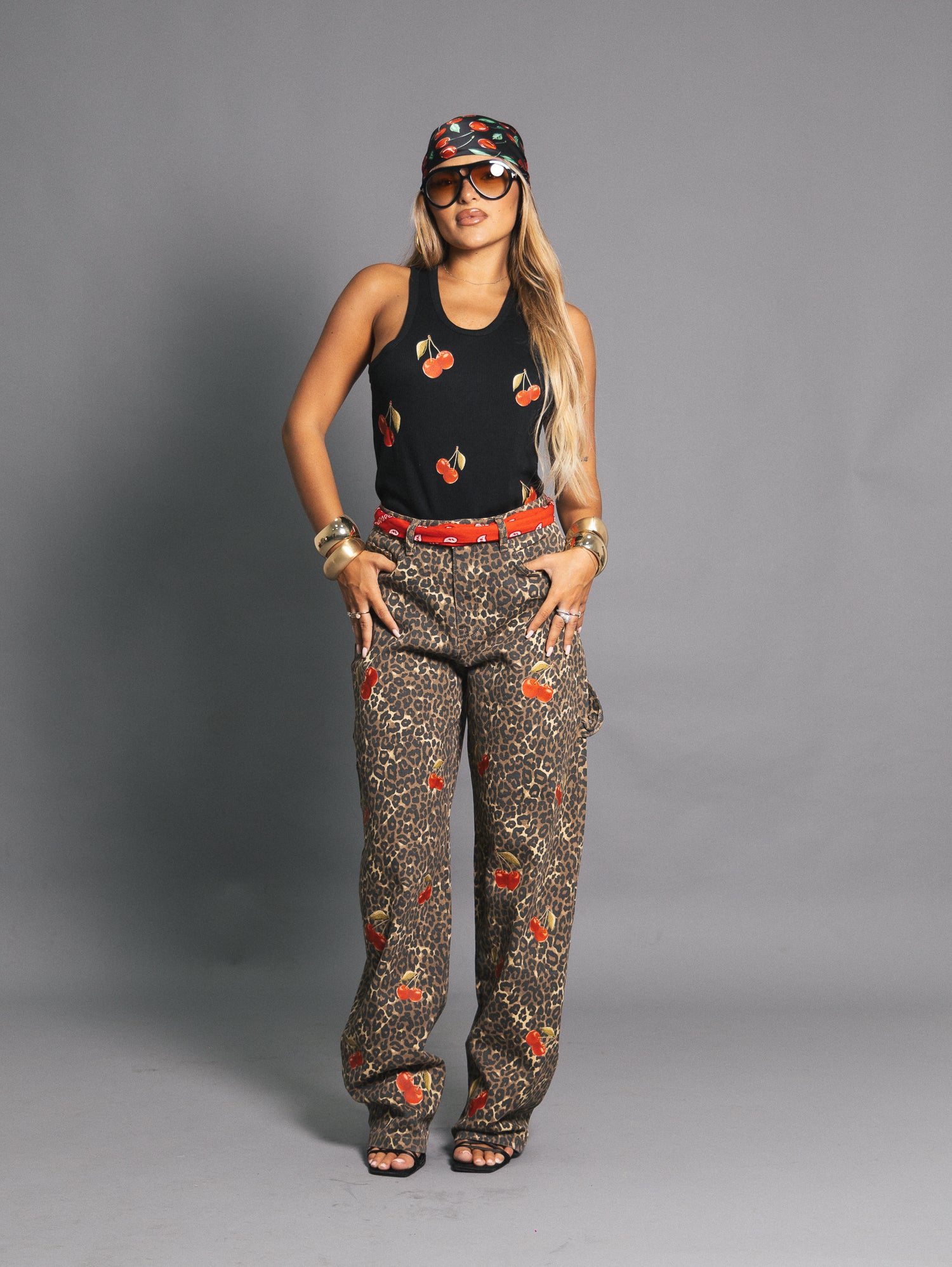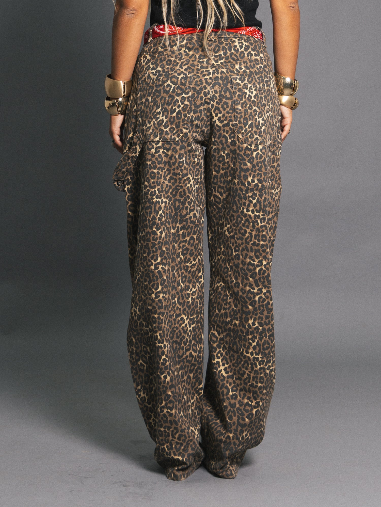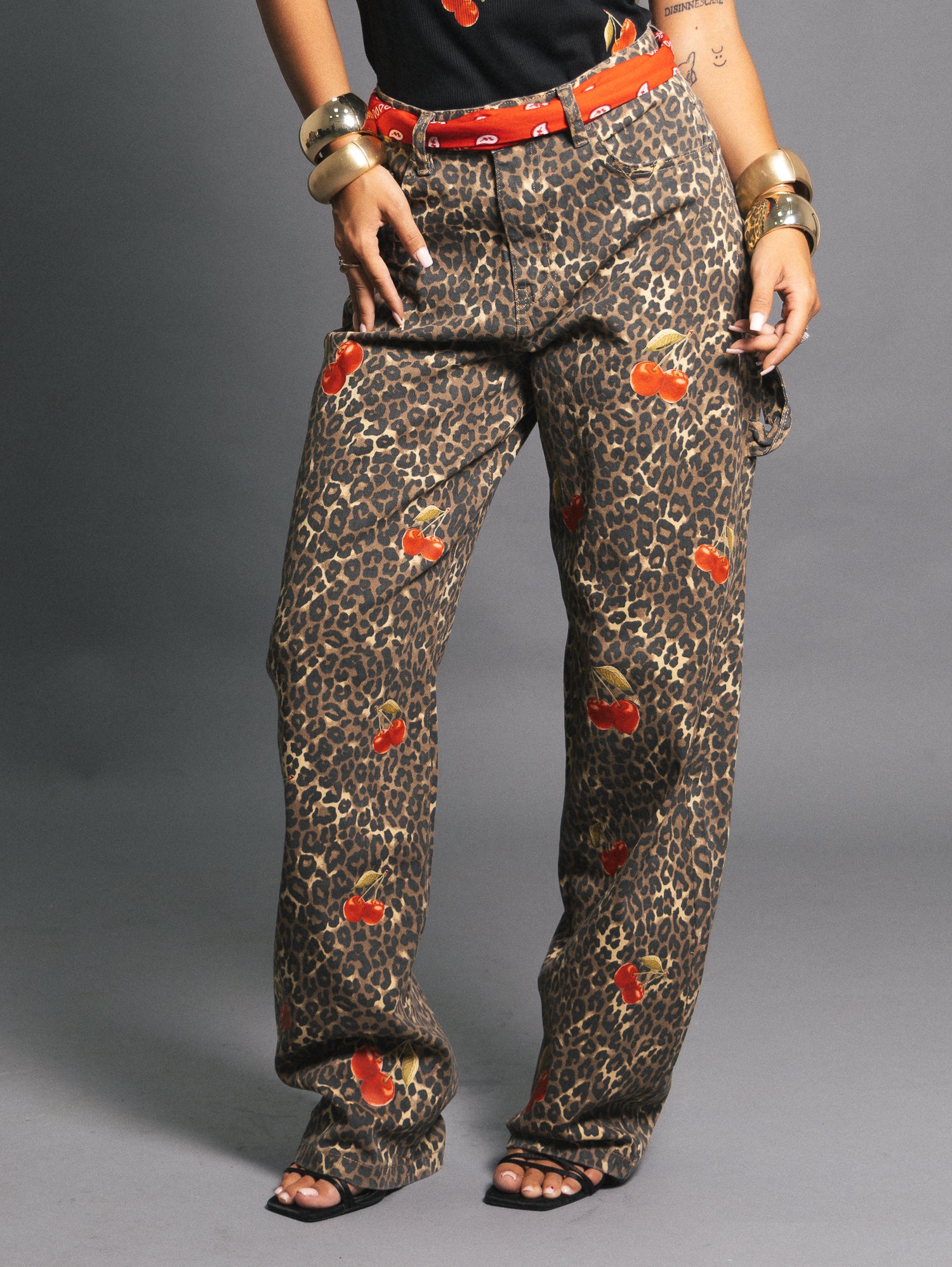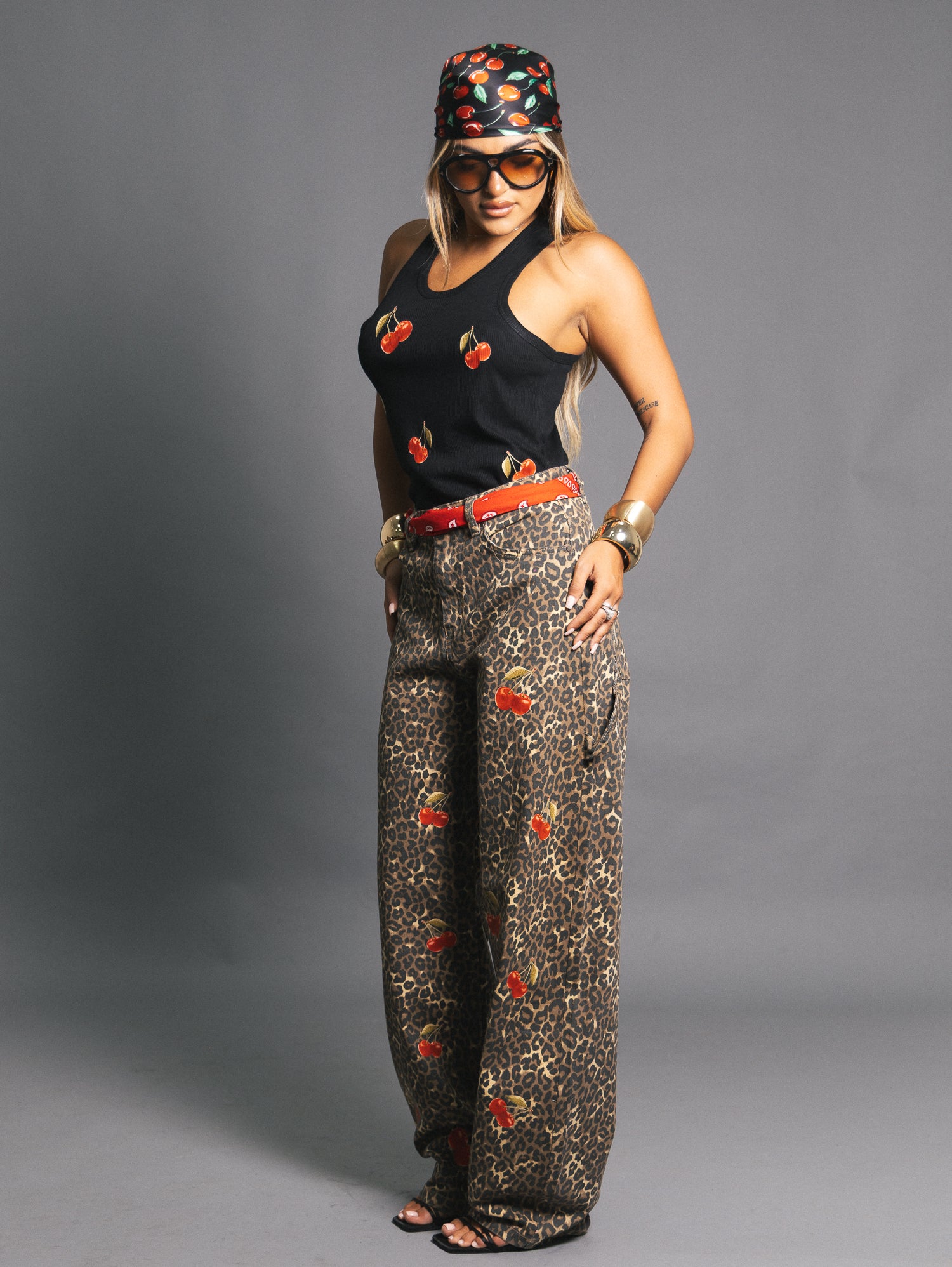 Pantalone in denim leggero stampa animalier tessuto leggermente elasticizzato vestibilita ballon con tasche e abbottonatura zip con bottone ..la modella indossa la taglia S.