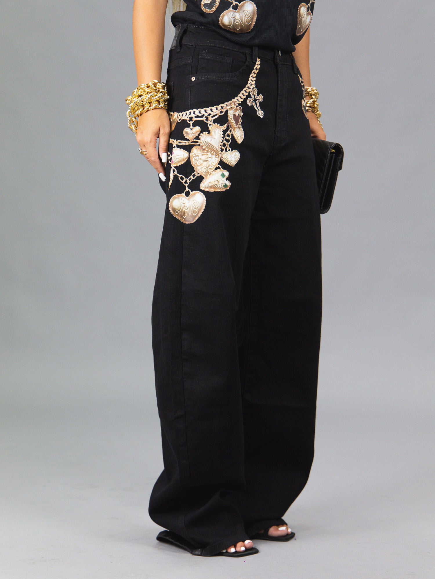 Pantalone in denim nero tessuto leggermente elasticizzato vestibilita ballon gamba larga con tasche e abbottonatura zip con bottone ..la modella indossa la taglia S