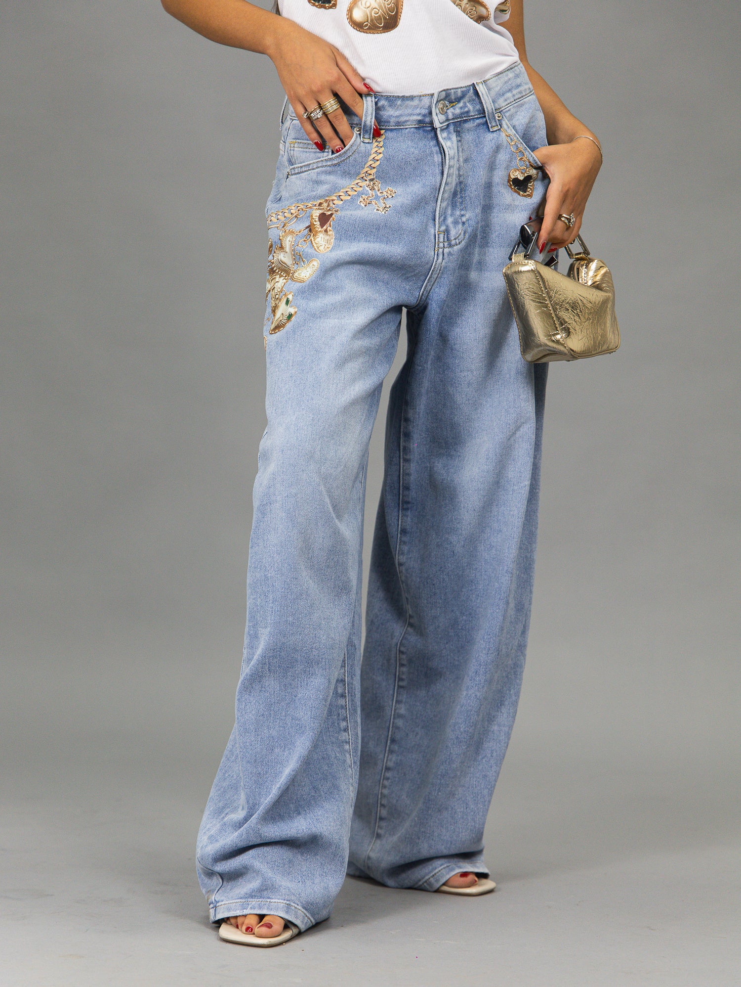 Pantalone in bluedenim leggero tessuto leggermente elasticizzato vestibilita ballon gamba larga con tasche e abbottonatura zip con bottone ..la modella indossa la taglia M