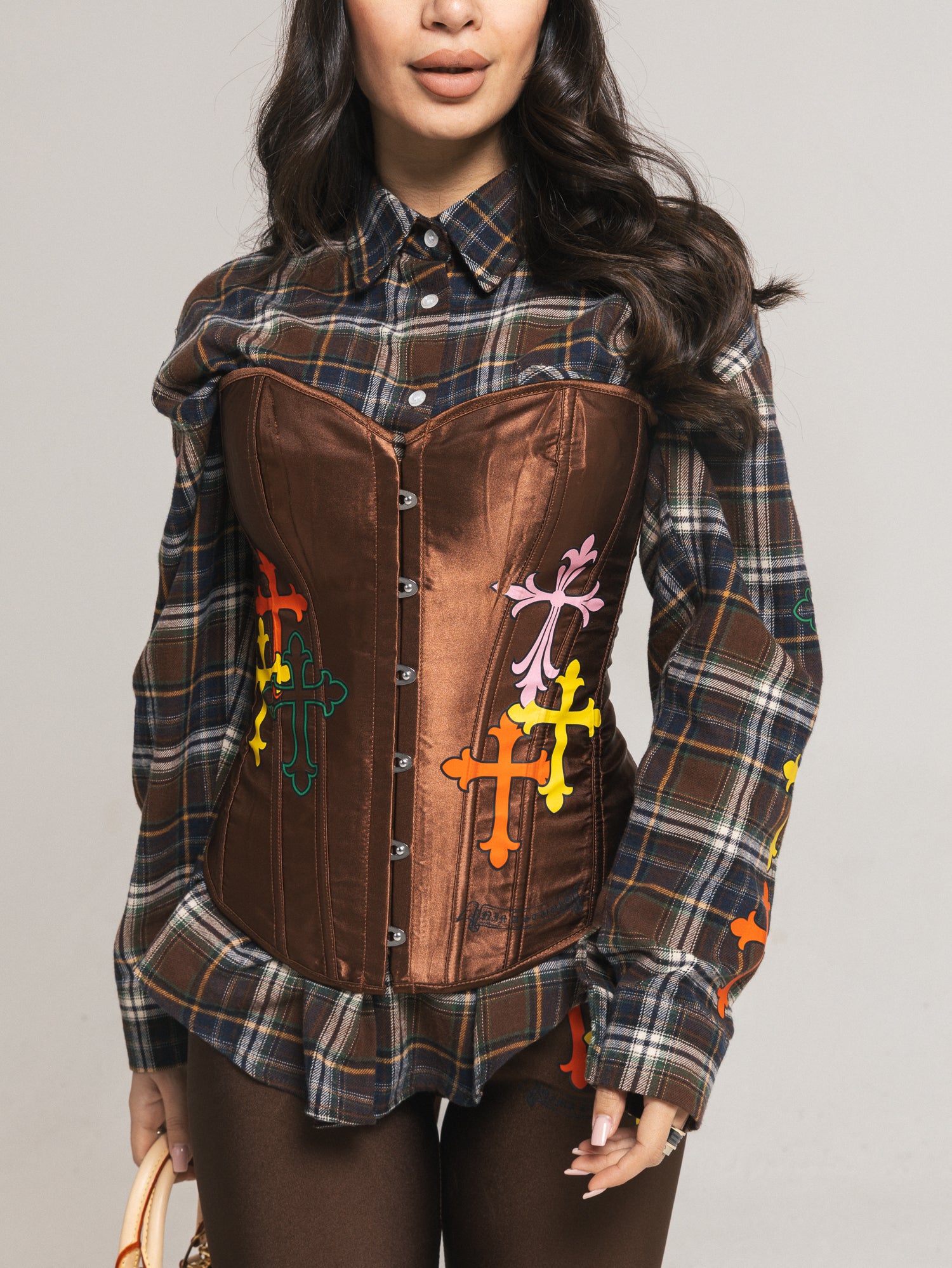 Top con scollo a cuore e spalle scoperte. Dettaglio abbottonatura in metallo sul davanti . Grazie alla Chiusura posteriore con stringhe regolabili veste fino ad una taglia XL .