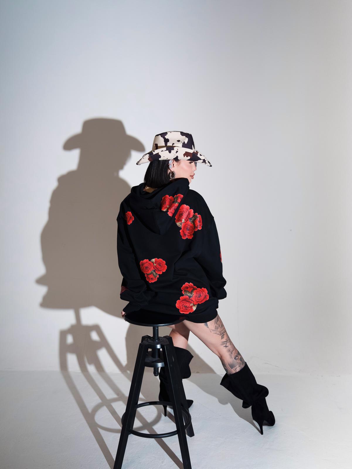 Felpa realizzata in filato misto cotone. Cappuccio regolabile con cordoncini con dettaglio di passanti. Maniche lunghe. Stampa effetto 3D.