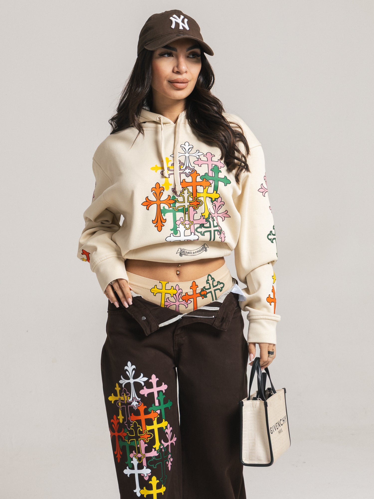 Felpa realizzata in filato misto cotone. Cappuccio regolabile con cordoncini con dettaglio di passanti. Maniche lunghe. Stampa effetto 3D.