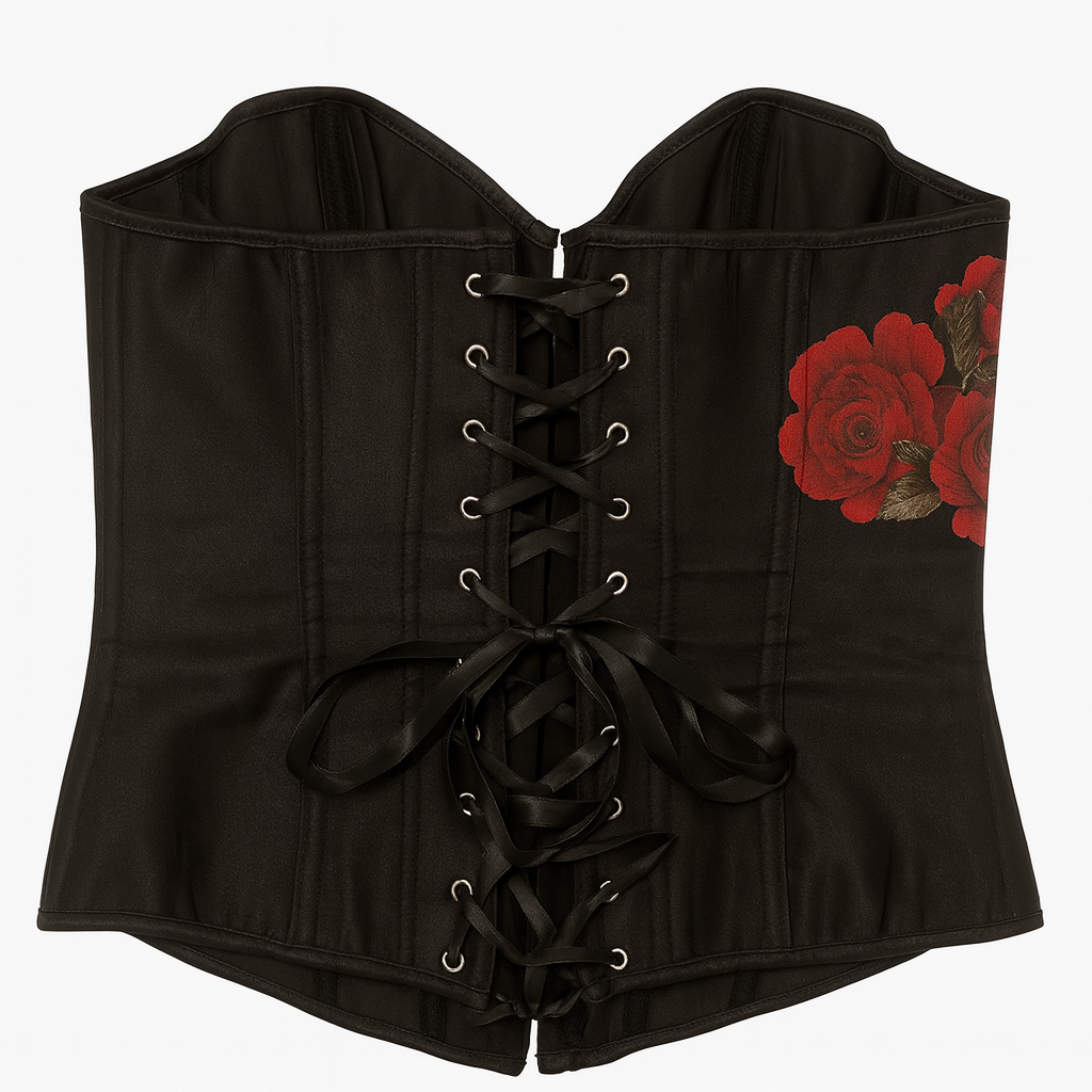 Top con scollo a cuore e spalle scoperte. Dettaglio abbottonatura in metallo sul davanti e stampa rose effetto 3D. Grazie alla Chiusura posteriore con stringhe regolabili veste fino ad una taglia XL .
